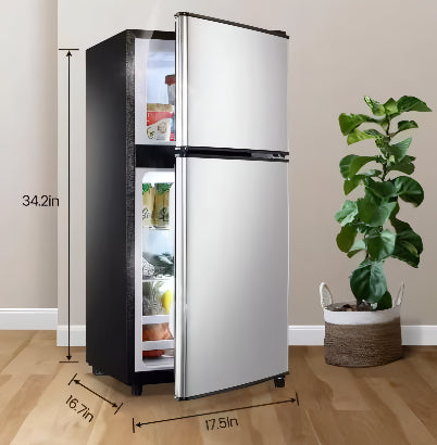Crib Ready's two-door compact refrigerator and freezer with ample storage space. Adjustable temperature control and removable glass! 17.5in L x 16.7in W x 34.2in H.